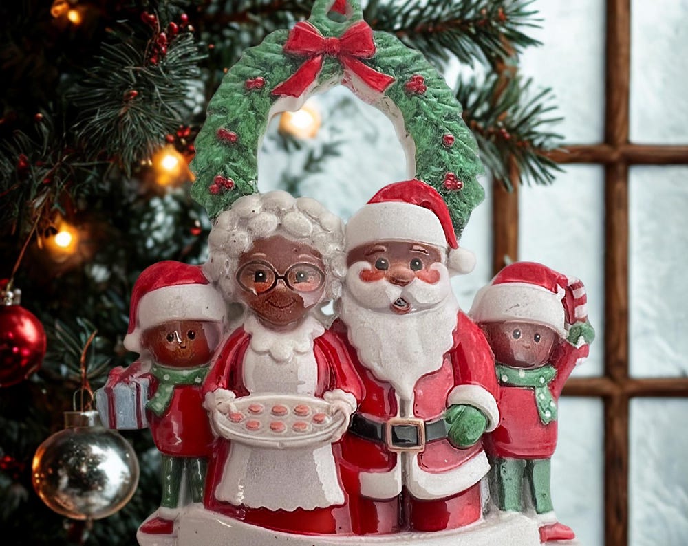 The Ini + Ayo Family Christmas pendant features a beautifully crafted family in festive holiday attire - perfect for adding warmth, representation and love to your christmas decor now and for years to come.